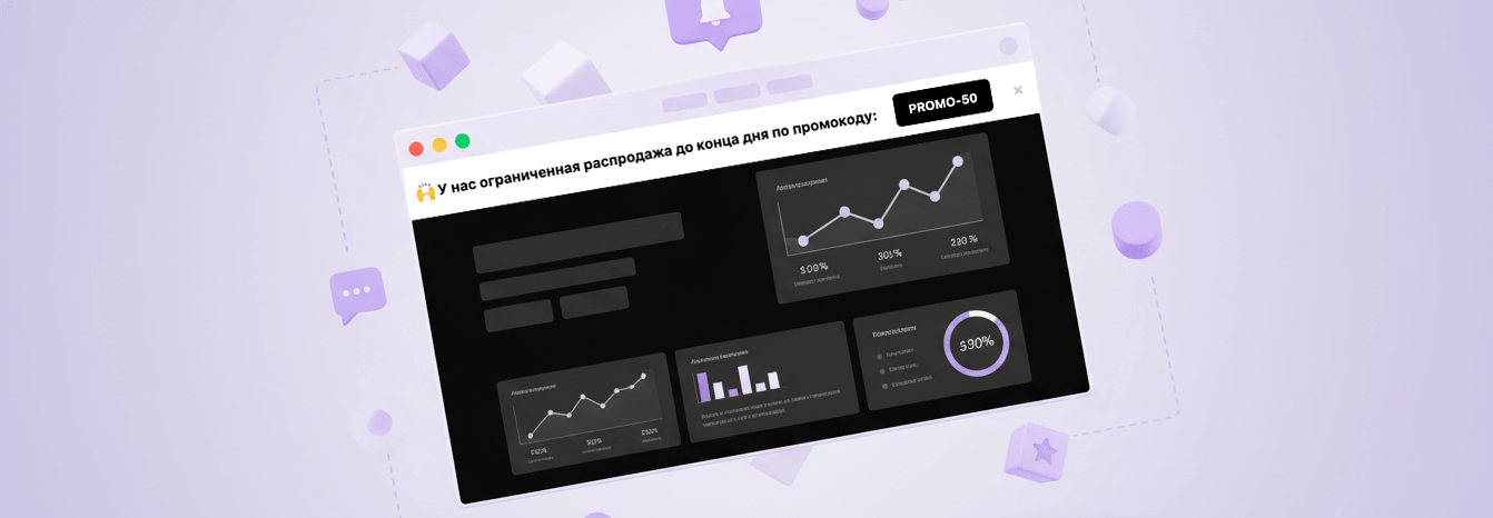 Узнайте, как легко добавить на ваш сайт заметную информационную панель, которая может быть закреплена вверху или внизу страницы, быть плавающей и содержать кнопки, промокоды, поля для ввода email или просто текст для важных объявлений и акций.